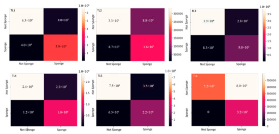 For each five-fold cross validation, the simple confusion matrix was represented using a heatmap (Figure 6). Dark colors indicate low values whereas lighter colors indicate high values. The best-case scenario is dark in the false positive and false negative quadrants (top right and bottom left, respectively) and lighter colors, high values in the true negative and true positive quadrants (top left and bottom right respectively) (Figure 6). Across all time series we see that the false positives and false negatives are dark except for the false negative in TL6 which is very light (8 × 105 Figure 6). This suggests there were many false negatives in TL6, possibly because this time series had fewer images than the other time series and the overall model performance was the lowest. In all the time series, the true negatives (‘sponge’ class) performed very well because the top left quadrant for all time series demonstrates a light color. This is not the case for the background or true positives (‘not sponge’ class) where they are all some shade of pink to dark purple, possibly due to the nature of the complexity of the background (Figure 6).