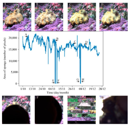 The chart in the center shows the change in area of the sponge in the 1932 masks for time scheme 5 (TL5), which began 10 October 2014 and ran until 28 December 2015. Images (A–D) are examples of images of the sponge at different points of the time series as indicated by the arrows and the corresponding label on the graph. Images (E–H) gave masks with an area at or near zero. In images (E,F,H), the sponge is obscured by something passing by or on the lens of the camera, while image (G) shows an area near zero due to a technical issue with the camera.