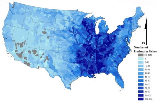 The more forested-associated fishes were concentrated in the southeastern United States, a biodiversity hotspot, and along the coasts where there are many highly forested areas (Figure 4) [,]. There are fewer forest-associated fishes in the parts of the United States without extensive forested area (Figure 3).