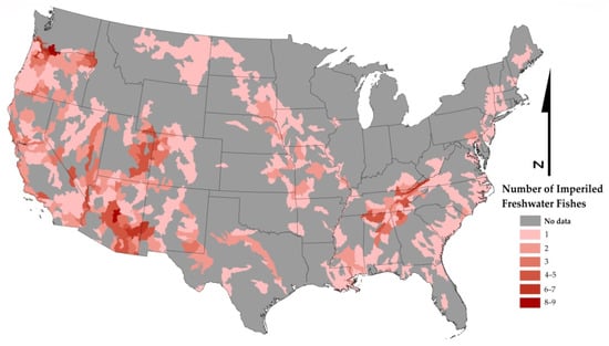 Freshwater ecosystems are some of the most changed and exploited on earth [,]. Throughout the world, freshwaters provide critical ecosystem services including water for municipal and agricultural uses, flood control, toxin filtration, and groundwater recharge, among others [,,]. Freshwater, and the biodiversity it supports, is a limited resource, constrained by the inter-annual patterns of the global water cycle, making freshwater ecosystems vulnerable to disturbance [,]. The interacting pressures of climate change, urbanization and other land use changes, introduction of species, and resource extraction are all forecast to increase in the future [,,,,]. Given these pressures on freshwater ecosystems, managers need comprehensive and consistently derived data and tools to respond to often competing priorities and needs to identify areas that are important for maintaining fish biodiversity and imperiled species [,]. Reserves designed for protection of terrestrial resources sometimes do not fully protect freshwater ecosystems, and management needs to be flexible to human changes [,,].