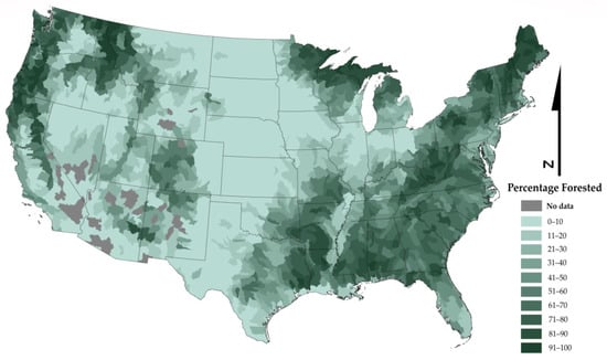 Forested land. The area of each HUC8 categorized with forested land was calculated from a baseline forest raster for the conterminous U.S. This raster was generated by harmonizing a map of the land base [] with land use maps from the National Land Cover Dataset series [,,,] according to the methods of Brooks et al. []. We constrained statewide forest areas to match tabulated 2016–2017 statewide total forest areas (Figure 3) as defined by the Resource Planning Act []. The area of each HUC8 categorized as forested was converted into a percent of the watershed area to standardize analysis across watersheds of varying sizes. For each HUC8, we assigned categories of percent forested area. Each HUC8 was classed as least forested (0–25%), low forested (26–50%), moderately forested (51–75%), or highly forested (76–100%) (Figure 3, Appendix A).
