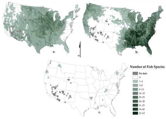In order to develop well-informed decisions for biodiversity conservation, it is essential to use detailed and scale-specific datasets that inform our understanding of how distribution patterns of species interact with one another [,,]. Here, we focused on native freshwater fishes in the conterminous U.S., exploring their patterns of biodiversity with respect to forested watersheds. Our focus on fishes and forests reflects strong management interest at state, regional, and national levels in their recovery and conservation as demonstrated by the listing of many fish as imperiled under the Endangered Species Act. Associating fish with forested ecosystems at a watershed-scale is important to inform current resource use, make restoration decisions, and for future forecasting [,].