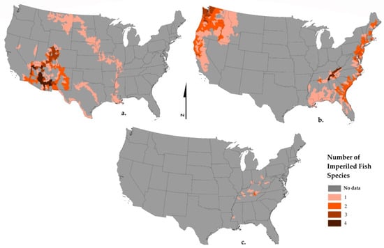 (a) Imperiled fishes associated with low-forested areas (number of endangered freshwater fishes in each HUC8 that have more than one quarter of their distribution is in watersheds with 26–50% forested area). (b) Imperiled fishes associated with forested areas (number of endangered freshwater fishes in each HUC8 that have more than half of their distribution in watersheds with 51–75% forested area). (c) Imperiled fishes strictly associated with highly forested conditions (number of endangered freshwater fishes in HUC8s that have more than three quarters of their distribution in HUC8s with 76–100% forested area). This dataset only includes HUC8s where endangered fish are recorded, and HUC8s without imperiled fish are recorded as “no data”.