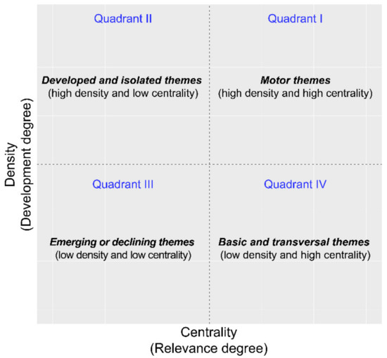 | Callons’ density (d) | Callon’s density measures the internal strength of the community. This value can be represented as a measure of the theme’s development. | Keyword i and j belong to the same theme. w is the number of keywords in the theme. eij is the equivalence index between keywords i and j. [42] |