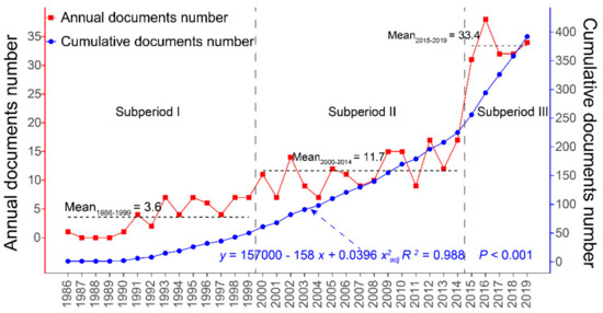 The WoS is a powerful literature database that can provide good access to bibliometric indicators of the published items and allow us to explore the literature in scientific fields. Moreover, the WoS database includes complete citation data of specific domains, covering more than 20,000 journals, conference proceedings, and books. Thus, our bibliometric analysis was conducted based on the literature from the WoS database. We started by searching for the topic keywords (including ‘Title’, ‘Abstract’, ‘Author Keywords’, and ‘Keywords Plus’) ‘hydrograph separation*’ and ‘isotope’ or ‘isotopic’ from the core WoS collection. We limited the research period to 1969 to 2019 and limited the document types to articles, proceedings, and reviews. Keywords and abstracts from before 1990 are not available on the WoS, so the number of documents collected before 1990 is limited [33,34]. In total, 392 publications from 1986 to 2019 met the selection criteria, and the full records and cited references of each were downloaded in plain text format for further analysis. Most publications (389) are written in English, two are written in French, and one is written in Spanish.