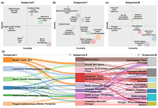Then, two indicators, Callon’s centrality and Callon’s density, can be used to measure the performance of the themes in each subperiod [42] (Table 1). Callon’s centrality is an indicator of the importance of a theme across a full set of publications, while Callon’s density is an indicator of the theme’s development. Then, a strategic diagram was applied to show the themes with different Callon’s centrality (x-axis) and density (y-axis) [37] (Figure 1). The themes with high density and high centrality were named motor themes (important and developed topics that show strong links with other themes in other quadrants), which were located in quadrant I; those with low density and high centrality were developed and isolated themes, which were located in quadrant II; those with low density and low centrality were emerging or declining themes, which were located in quadrant III; and those with low density and high centrality were basic and transversal themes (focusing on general issues that were transversal to the different research areas of a domain), which were located in quadrant IV. Then, a strategic diagram was constructed to assess the role of each theme in each subperiod qualitatively. Severe bibliometric indicators were used to quantify the impact of themes in different subperiods. Finally, a Sankey diagram was applied to present how different themes were connected and developed over previous decades. Thematic analysis and visualization, supplemented by the interpretation of important documents, help us clearly capture the details of IHS development and enhance our understanding of hydrological processes in streamflow generation.