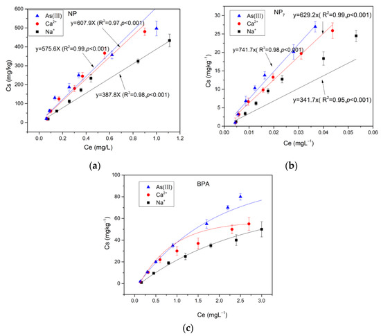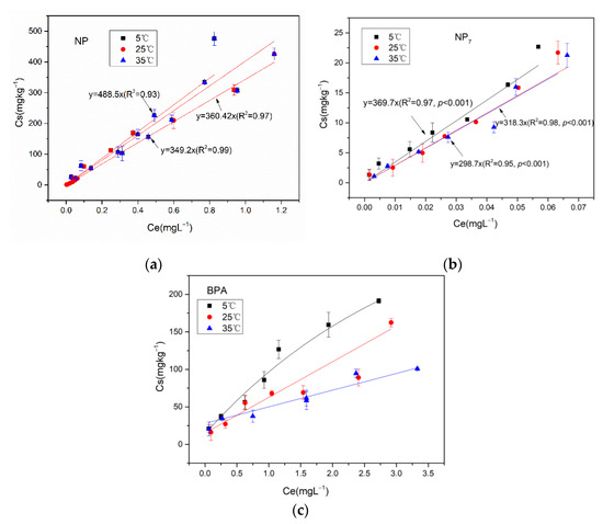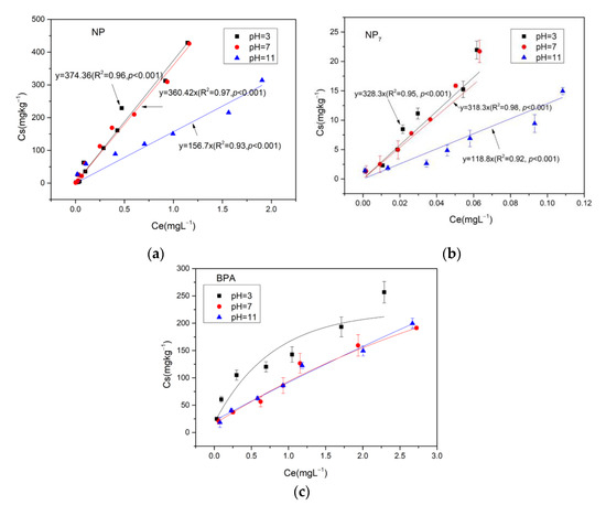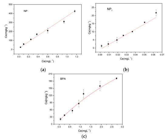 Adsorption of (a) NP, (b) NP7 and (c) BPA on soil. Note: Ce indicates the concentrations of pollutants in the liquid (mg·L−1). Cs indicates the concentrations of pollutants adsorbed on the soil (mg·L−1).
