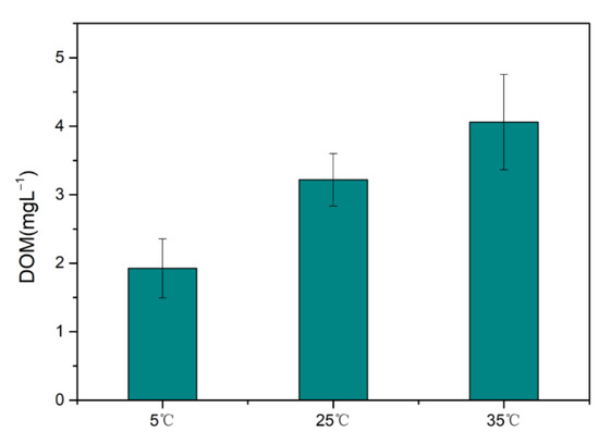 It can be seen from Figure 4 that the DOM dissolved from soil at 35 °C was 35.59% and 20.69% higher than that at 5 °C and 25 °C, indicating that increasing the temperature led to the increase of the organic matter dissolved into the aqueous phase. Sadmani et al. [63,64] found that under certain disturbances, DOM can diffuse from soil pore water into water columns since DOM displays a high capacity of BPA and NP binding with its natural ligands and adsorption sites. Therefore, the decrease of DOM in soil would lead to the decrease of adsorption of EDCs. On the other hand, DOM can be adsorbed on the soil particles again, causing a redistribution of EDCs in aquatic systems [63,65]. Meanwhile, with increasing temperature, the solubility of NP and BPA in water increased and the hydrophobicity weakened, which was also the reason that the adsorptions of NP and BPA decreased with the increasing temperature.