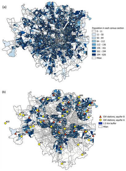 (a) Map of the sub-census units within the Milan municipality and (b) circular buffers with a radius of 1.5 km around the groundwater monitoring stations of aquifer B and their corresponding monitoring stations in aquifer A.