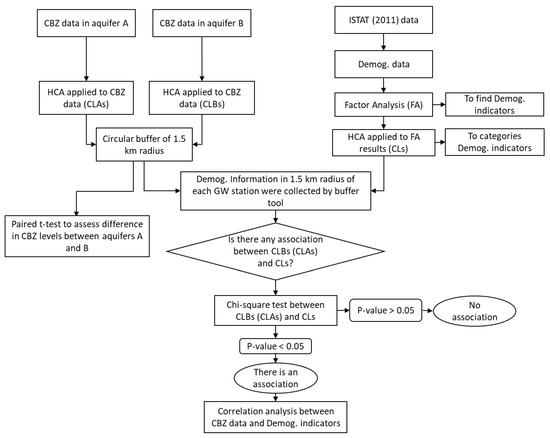 The chi-square test was also applied to assess the association of CBZ clusters in both aquifers with demographic clusters. The result was significant if the p-value was equal to or less than the alpha level (0.05). Moreover, Pearson correlation analysis was used to assess the correlation between the demographic clusters and the concentration of CBZ. Finally, the paired sample t-test was used to test if there was a significant difference between the averages of the CBZ concentrations in aquifers A and B. Figure 4 shows a simplified flow diagram for the methodology of this research.