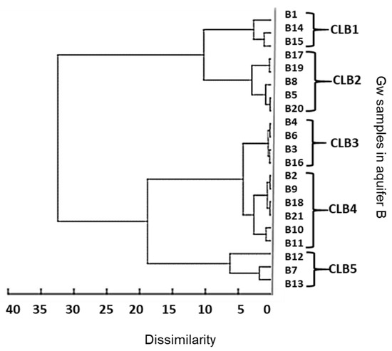 To reduce the effect of heterogeneity, hierarchical clustering was applied to the 21 measuring points of CBZ in the second aquifer (B). Cluster analysis helped to group the groundwater samples according to their similarities in terms of CBZ levels, as illustrated in the dendrogram (Figure 6). The dendrogram illustrates the distance between cases or groups that are clustered in a particular step. Dendrograms can generally provide information about the appropriate number of clusters to retain. The horizontal axis of the dendrogram represents the distance or dissimilarity between clusters, and the vertical axis represents the groundwater (GW) monitoring stations and clusters. The dendrogram suggests grouping the 21 groundwater monitoring stations of aquifer B into five clusters (CLBs). Cluster 1 (CLB1) includes the stations of B1, B14, and B15, with CBZ concentrations lower than 4 ng/L; cluster 2 (CLB2) includes the stations B17, B19, B8, B5, and B20, with CBZ values in the range of 7–11 ng/L. Cluster 3 (CLB3) consists of stations B4, B6, B3, and B16, with CBZ concentrations around 16 ng/L. Cluster 4 (CLB4) contains the stations B2, B9, B18, B21, B10, and B11, with CBZ values between 12 and 15 ng/L, and cluster 5 (CLB5) includes the stations B12, B7, and B13, with the highest levels of CBZ above 22 ng/L (Table 1). More information about the classifications based on cluster analysis and descriptive statistics of each cluster can be found in Supplementary Materials Tables S4 and S5.
