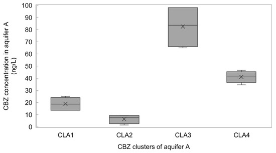 Box-and-whisker plot illustrating the CBZ concentration of aquifer A observed for each cluster (CLA).