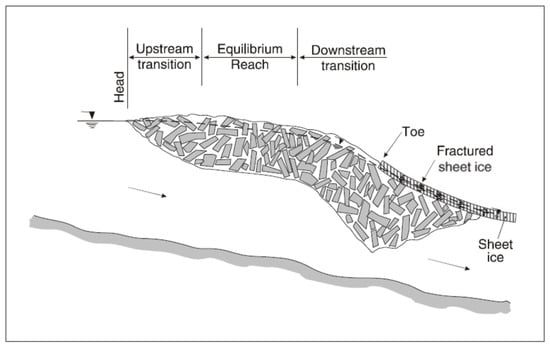 Schematic illustration of a fully developed ice jam. The equilibrium reach is usually much longer than indicated in the sketch but may be absent in short jams. Reproduced from []. Crown copyright, published by CGU-HS Committee on River Ice Processes and the Environment.