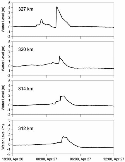 Examples of jave waveforms are illustrated in Figure 2. The rise to the peak stage lasted 15 min in total, but the first 5 min brought about a rise of ~4 m at the farthest upstream station []. This extreme rate of rise is one of the highest known to date. Comparable rates of rise have also been recorded in the Restigouche River (~3 m in 6 min; []) and the Athabasca River (~4.5 m in 6 min; []).