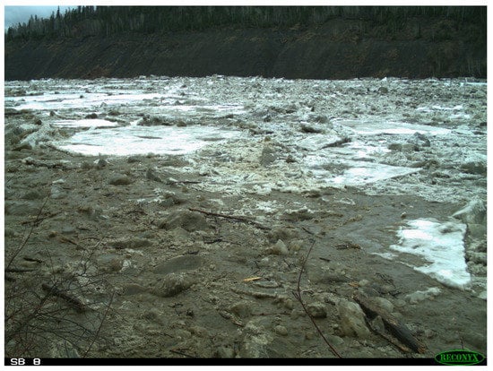 Chassiot et al. [] identifies several terrestrial and fluvial processes that affect bank erosion. Terrestrial processes include slow-acting preparatory processes that affect ground stability, such as groundwater seepage, freeze-thaw processes, and desiccation cycles, and more rapid, mass-wasting processes, such as debris falls and slumps. Fluvial processes include abrasive removal of bank sediment by flowing water, waves, moving ice, and highly dynamic processes associated with ice-jam release []. In permafrost regions and cold regions with seasonally frozen ground, progressive thawing of riverbanks in contact with flowing water results in heat transfer between water and ice that reduces particle attachment (thermal erosion), producing easily removable sediments that can be destabilized and removed by terrestrial and fluvial processes [].