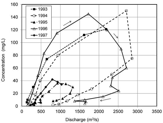 The SSCs gradually decrease as river flow decreases and water levels subside; however, SSCs were found to decrease to pre-event values much faster than does discharge, with the peak discharge lagging 1–3 days later than the peak SSC, thereby indicating a limit on available sediment supply during the breakup event. In many rivers, such as the Saint John River, the rate of sediment supply rather than the flow capacity limits the amount of sediment transport. The hysteresis loop in the sediment rating curve of SSC versus discharge (Figure 7) is an indication of limits to sediment supply. The relationship between suspended-sediment loads and flow discharge can also vary depending upon the type of hydroclimatic event and its intensity. Though concentration–discharge relationships involve large scatter, sediment loads delivered during specific runoff events correlated well with corresponding water volumes [].