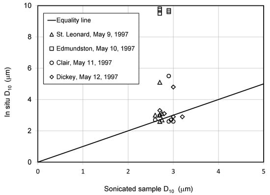 To investigate whether flocculation occurs in the river environment, a field Malvern unit was deployed at two bridge sites (Edmundston, St. Leonard) on 24 August 1993 (flow ~75 m3/s) and at four bridge sites (Dickey, Clair, Edmundston, and St. Leonard) in May 1997 (flow ~1500 m3/s). During the August 1993 measurements, D10, D50, and D90 showed little lateral variability with average values of ~4, 14, and 35 μm, respectively, while the May 1997 results indicated greater variability along and across the channel (D50 ~11 to 29 μm). Comparison with corresponding sonicated samples indicated significant flocculation at the higher flow condition (Figure 8). The presence of moving ice precluded deployment of the field Malvern unit during breakup conditions. Indirect evidence suggests that flocculation may be even more intense during breakup [].