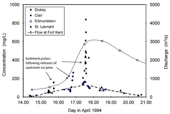 The temporal and spatial variation of the SSC was investigated by acquiring and analysing suspended-sediment samples at four bridges along the Saint John River from Dickey, Maine, USA to Saint-Leonard, New Brunswick, Canada [,]. Using the bridges as platforms, samples were acquired by dipping standard 750-mL glass bottles into the river or inserting them in a P72 point-integrating fish-type sampler. During typical freezeup conditions, measured SSCs along the Saint John River ranged from 0 to ~2 mg/L []. Concentrations increased on occasion, when the freezeup process was interrupted by small runoff from minor rain-on-snow events, decreasing again as the flow subsided. Similar values of SSC (~0 to 2 mg/L) were also found during steady-flow conditions in the winter right up to late March and even in the first half of April []. Peak runoff-induced sediment concentrations during the 1993- to 1997-inclusive breakup events ranged from ~35 to 150 mg/L (Figure 7), much greater than under open-water conditions. As described in Section 4, even higher SSCs were measured during brief sediment “pulses” accompanying the passage of javes. The suspended-sediment loads associated with breakup events can be the greatest fraction of the total annual loads [].