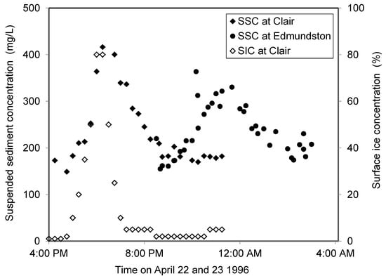 Prowse [] reported measurements and analyses of SSC during the 1987 pre-breakup and breakup periods on the Liard River near its confluence with the Mackenzie River. All sampling was done 300–500 m from the left bank in an approximately 700-m wide reach used by the Water Survey of Canada to monitor discharge and sediment of the lower Liard River (hydrometric station No. 10ED002, Liard River near the Mouth, drainage area = 275,000 km2). Up until 26 April, SSCs remained below 10 mg/L but then began to steadily rise as breakup occurred upstream and along tributaries. Measurements made on 1 May from a helicopter during the ice fracturing and fragmenting period revealed a sediment concentration of 70 mg/L. The general rise in SSC prior to breakup at the sampling site is probably attributable to a rise in velocities and discharge and additional sediment contributions from upstream tributaries, including some more southern rivers which break up earlier []. Ice cleared the reach on 2 May, and a local, small jam occurred downstream, increasing water levels in the sampling reach. A sample on 4 May revealed that the sediment concentration had risen to approximately 120 mg/L. The highest measured SSC during the 1987 breakup of approximately 1067 mg/L occurred on 6 May during release of jammed ice remaining on the lower Liard []. This value far exceeded normal sediment concentrations for open-water conditions with equivalent discharge and was closer to annual peak-sediment concentrations recorded at two to five times greater discharge. Upstream ice-induced erosion is most likely responsible for the rapid increase during the 4–6 May breakup period []. Higher sediment concentrations could be produced by more dynamic breakup events than the moderate 1987 event, which was characterized by a nonuniform downstream breakup progression typical of a thermal breakup.