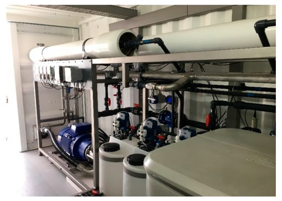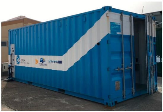 This study was carried out using the operation data of a small-scale SWRO desalination pilot plant with a capacity of 80–100 m3/day. It is an industrial plant designed by the Canary Islands Institute of Technology (ITC) to be used in R&D projects within the DESAL + LIVING LAB platform. The plant is inside a 20 ft shipping container (Figure 1), which makes it enormously versatile in terms of its transport to warranty that could be moved to different locations for being fed with different seawater conditions. In terms of design and operationality, this plant should be similar to one on-board SWRO plant except for the high level of sensors installed and the possibility to move the nominal operation point, according to its research purposes. Some of its main characteristics are shown in Table 1.