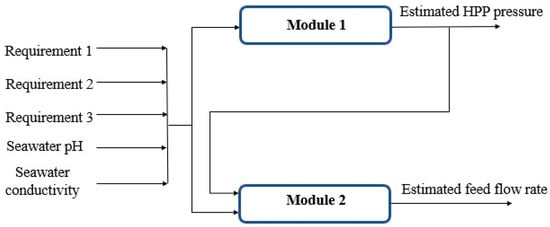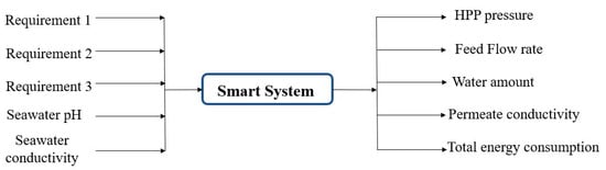With this system, it is possible to optimize the operation of the desalination plant based on the initial requirements. These vary depending on each case study. The inputs to the function were the three requirements mentioned before, pH, and conductivity of the feed water. The function outputs the HPP operating pressure, the feed flow rate, and the actual values of the permeate conductivity, amount of water, and total energy consumption of the plant. This is shown in Figure 7.