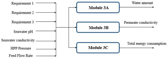 Note that modules 1 and 2 were used to train the system and to obtain the values for the plant’s actuators. In this case, these values, and the input variables used previously, were input to this new structure. This made it possible to obtain the current values of the daily amount of water, permeate conductivity, and total energy consumption of the desalination plant. This second system is shown in Figure 4, while the graphs and the results obtained from the training are given in the next section. It is important to point out that modules 3A, 3B, and 3C are also ML models trained using the values from the same table of optimal values (Table 4). In this case, the whole set of chosen output variables were different from the variables used in modules 1 and 2.