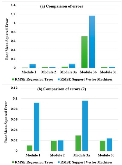(a) Errors according to the RMSE metric in the system’s five modules; (b) similar graph to the previous one, ignoring module 3B, to observe the error more clearly in the other modules.