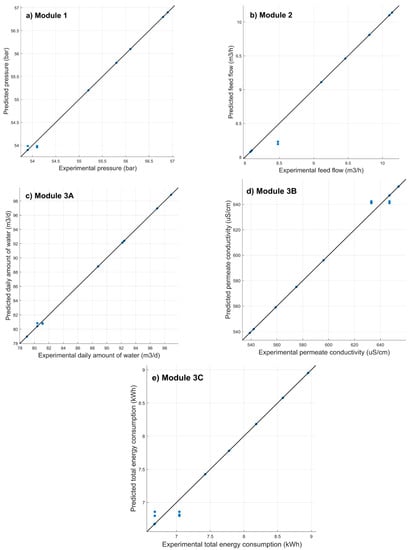 In this specific case, the marine vessel’s demands are a minimum of 75 m3 of water per day, a maximum conductivity of 600 µS/cm, and maximum energy consumption of the desalination plant of 9 kWh. For these initial data, the system was trained, and the results obtained were within the estimated parameters, so the results obtained were satisfactory.