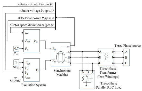 A generator is the key component of the power system. First−order, three−order, five−order, and even seven-order generator models are commonly used to conduct research. However, it is a fact that the higher the model order, the higher the cost in terms of data requirements and calculation time [25]. Generally speaking, a third-order model has the advantage of simple structure and also considers the excitation system, which is widely used in dynamic analysis of the power system. Therefore, a third-order synchronous generator model is used in this paper, which is written as