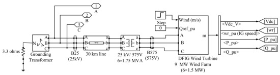 Here, the wind farm cluster consists of 6 wind farms, each with a 1.5 MW wind turbine and a DFIGURE. It is connected to the external 25 KV AC grid through a 30 km and 25 KV transmission cable with the nominal power rating of 9 MW. The main purpose of this paper is to investigate the parameter uncertainty on the regulation performance of PSPP in a hybrid system. In order not to increase plant cost, the number of wind turbines and wind speed types remains unchanged. The WPGS model based on MATLAB/Simulink is shown in Figure 5.