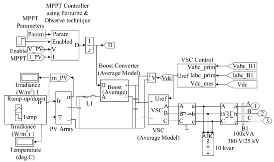 Due to the nonlinear photovoltaic cell array, the related controller is considered to maintain the photovoltaic power generation efficiency. Based on the above consideration, a generic model of PPGS developed in MATLAB/Simulink software is shown in Figure 6.