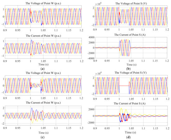 In the hybrid power system model, two fault points, i.e., H and S, are set up at the output terminal of PSPP and infinite power supply to simulate the situation of the three−phase short circuit fault (TPSCF). The fault occurs at 1 s, is resected at 1.04 s, then the system gradually returns to normal operation. Meanwhile, the three−phase voltage and current of the output terminal of Wind Power Generation (WPG) (labeled as W) and grid-side (labeled as S) are measured, respectively. The corresponding numerical experiments are shown in Figure 8.