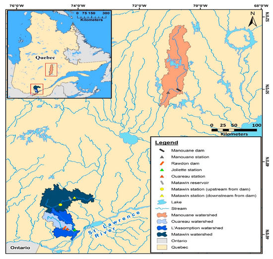 Flow data were taken from the website of the Centre d’expertise hydrique du Québec of the Quebec Ministère de l’Environnement (https://www.cehq.gouv.qc.ca/, accessed on 30 May 2017). For the Matawin River, flow data downstream of the dam were extracted from the Environment Canada CD-ROM until 1994. After that date, flow data were kindly provided by Hydro-Québec, the operator of this structure. Precipitation and temperature data measured in the three watersheds were taken from the Environment Canada website (https://www.ec.gc.ca/, accessed on 24 June 2017). In the watershed of the L’Assomption and Matawin rivers, temperature and precipitation are measured at the Joliette and Saint-Michel-Des-Saints stations, respectively. For the Manouane River watershed, these data are measured at the Bagotville station (a military airport), which is the reference station in the region.
