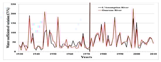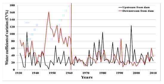 Comparison of the interannual variability of values of winter coefficients of variation upstream and downstream of the Matawin dam during the period from 1930 to 2010.
