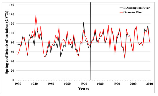 Comparison of the interannual variability of values of spring coefficients of variation at the Joliette station (L’Assomption) and downstream of the Rawdon station (Ouareau) during the period from 1930 to 2010. Vertical bars indicate years of breaks in mean.