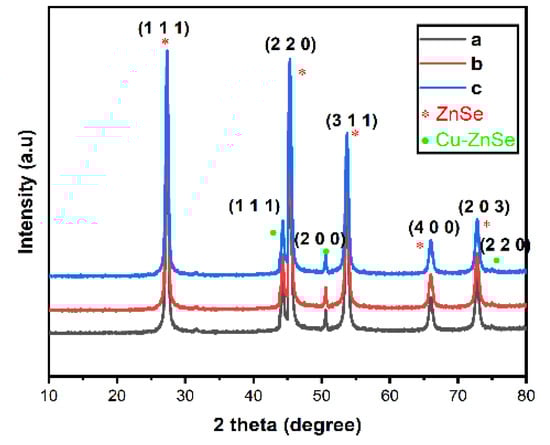 The XRD pattern of copper-doped ZnSe nanoparticles is shown in Figure 1. The copper peaks are indexed at 2θ = 43.8°, 50.7°, and 74.3°, corresponding to (111), (200), and (220) miller planes, respectively. Their patterns are well-matched with the std. JCPDS card no. of 04-0836 with an FCC (face-centered cubic) structure [25,26]. The copper modifies the ZnSe nanoparticles, as shown in Figure 1. The ZnSe nanoparticles’ peaks were observed at 2θ = 27.3°, 45.3°, 53.7°, 66°, and 73° for (111), (220), (311), (400), and (203) planes, respectively. The distinct peaks of copper as introduced into the ZnSe nanoparticles by doping have marginally changed the nature of the ZnSe nanoparticles. By introducing copper into ZnSe, the cubic structure is modified with respect to the size and growth of orientation of the NP, which converts copper to Cu (II) phase. The Cu (II) phase is confirmed by the narrow XRD peaks at 31.7°. The Cu (II) phase was reassured by the XPS technique. The pristine ZnSe nanoparticles are reoriented by the addition of copper into the crystal system. The copper-doped ZnSe nanoparticles’ size was determined by the Debye–Sherrer equation. The calculated values are 18 < 24 < 31 nm for 0.01 < 0.05 < 0.1 M copper-doped into the ZnSe nanoparticles, respectively [27].