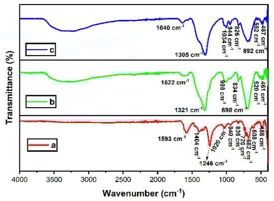 The synthesized sample purity and surface modification of ZnSe nanoparticles doped with different Cu concentrations were evaluated by FTIR spectrum, as depicted in Figure 2. The different concentrations of Cu2+ cations in ZnSe nanoparticles demonstrate different kinds of bond stretching and vibrations, as seen in the spectrum. Sample a contains a low intensity OH stretching bond. However, sample b and c show high intensity of the bond and a broad spectrum of OH stretching at ~3500 cm−1 is observed. The peaks at 1593, 1622, and 1640 cm−1 indicate the interaction between the Cu2+, Zn2+, and Se2− of the carboxylic acid group [28]. Bond frequencies at 1246, 1321, and 1305 cm−1 are responsible for the stretching vibration of the C-O group [29]. The peak intensities gradually increase when Cu2+ cation concentration increased, boosting the interaction with the ZnSe nanoparticles. The increased peak values denote the reformation of the ZnSe nanoparticles when doped with Cu. The peaks at 488, 461, and 487 cm−1 are attributed to the presence of Zn-Se stretching vibrations, while those at 944, 940, 836, 834, 826, 720, 698, 692, 552, and 520 cm−1 correspond to the formation of Cu-Zn-Se by reduction of Cu2+ [30]. The obtained peaks strongly indicate surface re-orientation of ZnSe nanoparticles and reduction of Cu2+ and ZnSe nanoparticles [31]. The surface was strongly modified with the Cu addition/doping of the ZnSe nanoparticle in sample c. Sample c has a high-level interaction between the reactants and nano reduction of the synthesized samples occurred.