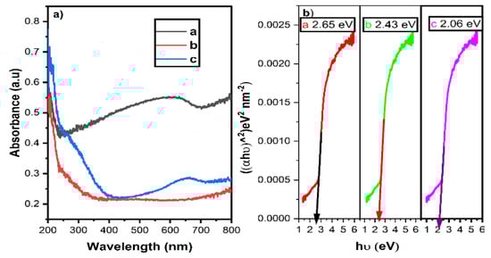 Figure 3a,b shows the synthesized Cu-doped ZnSe absorption and bandgap energy as measured by UV/DRS spectroscopy. The undoped ZnSe nanoparticles show an absorption edge at 390 nm. However, when Cu was added to the systems, the adsorption edge shifted towards the lower wavelength side at 245 nm and broad-spectrum (shoulder peaks at 650 nm) in the visible region [31]. The Cu2+ ions to (Zn2+ Se2−) ZnSe create more active sites at the surface. The blueshift occurred as a result of the introduction of the Cu2+ ions. The transfer of charge Cu2+/Zn2+ → Se2− has been shown to increase the optical behaviour. The interaction between copper, zinc, and selenium shifted the optical tendency to the lower side of the wavelength. In this case, the optical band gap is determined by the Kubelka–Munk theory. The calculated band gap values are 2.65 eV, 2.43 eV, and 2.06 eV [25,32]. The narrow bandgap represents photocatalytic activity in the range of visible light. The energy gap between the pure ZnSe and doped ZnSe nanoparticle is ∆Eg = 0.71 eV, which is redshifted. The decreased bandgap confirmed the formation of the active sites [33]. The penetration/scattering ability is the main reason for the decreased bandgap. These results suggest the potential application of the material for improved catalytic activity.