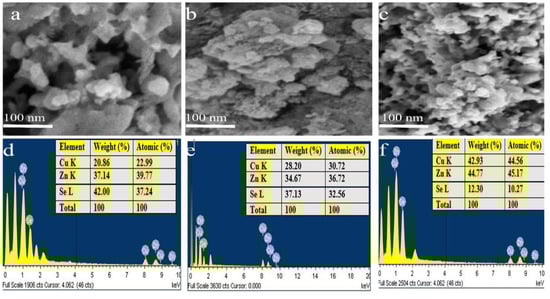 The surface morphology and elemental composition of the synthesized Cu-doped ZnSe nanoparticles were evaluated by field emission scanning electron microscope (FE-SEM) coupled with energy dispersive X-ray analysis (EDX), as shown in Figure 4a–f. The raw ZnSe nanoparticles have been shown to exhibit a spherical shape [32]. The presence of Cu2+ ions in the ZnSe surface modifies the shape and size of the Cu-doped ZnSe nanoparticles (Figure 4a–c). The Cu-doped ZnSe nanoparticles exhibit a quasi-spherical shape. The modifications in the structure due to the dopant in various concentration (0.01, 0.05, and 0.1 M of Cu2+ ions) induce a structural and morphological stability. The presence of low-level Cu2+ in the ZnSe nanoparticles shows a mixed spherical shape (Figure 4a,b). The copper-rich ZnSe nanoparticle shows a better quasi-spherical shape than samples a and b (Figure 4c).