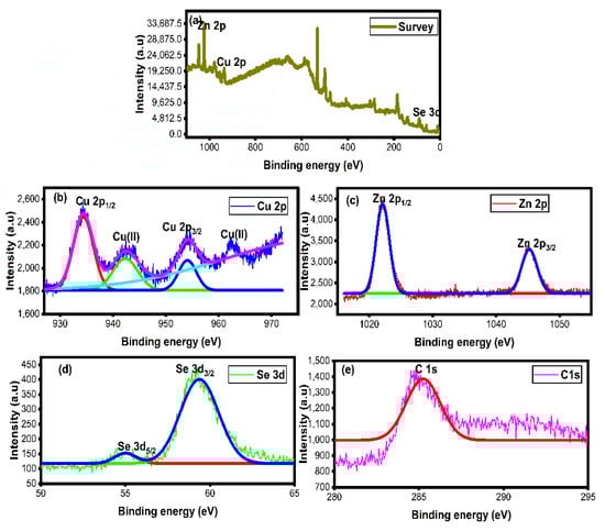 The valency and chemical state and bonding between the materials were elucidated by X-ray photoelectron spectroscopy (XPS). Figure 6a–e represent the characteristic spectrum of Cu-doped ZnSe nanoparticles in the survey spectrum (a), Cu-2p spectrum (b), Zn-2p spectrum (C), Se-3d spectrum (d), and C-1s spectrum (e). The Cu 2p3/2 (934.58 eV) and Cu 2p1/2 (954.58 eV) (Figure 6a) represent the metallic Cu core with the difference of 20 eV (spin-orbit coupling). The remaining two peaks of the copper spectrum indicate the Cu 2p state and represent the existence of the Cu2+ with a binding energy of 942.65 eV and 962.65 eV [35]. The peaks at 1022.23 eV and 1045.48 eV in Figure 6b point towards Zn 2p1/2 and Zn 2p3/2, respectively (Figure 6c) [36]. The selenium peaks at 59.33 eV and 55.06 eV represent Se-3d3/2 and Se 3d5/2, respectively [37]. The copper state of C-1s represents the existence of Cu2+, Zn2 +, and Se2− in 285.40 eV (Figure 6e). The metal ions and bonding between them demonstrate the successful preparation of Cu-doped ZnSe nanoparticles. Copper is widely used for photocatalytic applications thanks to its oxidative tendency. The zinc selenide nanoparticles doped with copper metal result in enhancing the catalytic activity used for degradation of the organic dyes and antibacterial activity.