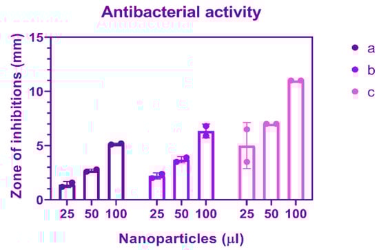 The antibacterial activity of Cu-doped ZnSe nanoparticles was investigated by the dose diffusion method against gram-positive (S. aureus) and gram-negative (E. coli) bacteria. The Cu2+ ions increased the zone of inhibition for the target species as the concentration of Cu-doped ZnSe nanoparticles increased from 25 μL to 100 μL. The three different concentrations of Cu-doped ZnSe nanoparticles were used to target the bacterial strains and develop a zone of inhibitions, as shown in Figure 7. The largest zone of inhibition is shown for the highest concentration of Cu. The dissolution rate and release of ions determined the destruction of the strains. Here, the gram-negative bacterial growth was suppressed more than that of gram-positive bacteria. The gram-negative bacteria cell wall is weaker than that of the gram-positive bacteria. Therefore, the Cu2+ ions easily enter and constrict the growth of negative bacteria. Thus, the Cu-doped nanoparticles produce efficient antibacterial activity [38].