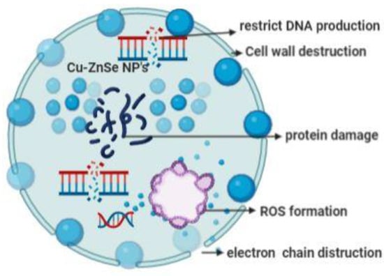 The possible mechanism of Cu-doped ZnSe nanoparticles against bacteria is shown in Figure 8. The mechanism is based on two important actions, which are