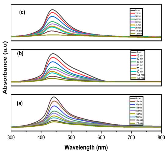 Photocatalyst dye degradation with (a) 0.01 M Cu, (b) 0.05 Cu, and (c) 0.1 M Cu in Cu/ZnSe nanoparticles against MO dye spectrum.