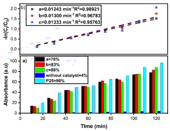 The photocatalytic dye degradation of Cu-doped ZnSe nanoparticles was examined against the MO dye under a visible light source using a xenon lamp above 400 nm. The degradation spectrum is shown in Figure 9. The MO dye absorbance decreased with the addition of a catalyst and increased time interval. The degradation activity of pristine ZnSe nanoparticles shows a decrease in absorbance by 75% for MO in 120 min [40]. The dye is slowly shown to lose its colour with increasing time. The presence of copper in Cu-doped ZnSe nanoparticles enhances the surface area and induces photo charge carriers to degrade MO dye, as depicted in Figure 10a,b. The % of photodegradation of the dye is estimated as 78% < 83% < 87% for different concentrations of Cu in ZnSe nanoparticles The photolysis process without the catalyst shows a meagre value of photodegradation of MO, i.e., 4%. The commercial photocatalyst of P25 as compared with Cu/ZnSe nanoparticles reflects a degradation of 96%, which is nearly equal to the Cu/ZnSe catalyst at 0.1 M Cu concentration. The visible light source was irradiated onto the Cu-doped ZnSe nanoparticles with MO dye in the solution, allowing the electrons to move from a low energy valence band to a high energy conduction band. The charge carriers as electrons and holes render the property of reduction and oxidation in the conduction band and valence band, respectively. The copper metal may improve the surface morphology of ZnSe nanoparticles, which could allow more light penetration to the active sites with a decrease in band gap. The p-type copper-doped ZnSe nanoparticles induce the process of oxidation and reduction process for efficient catalytic activity. The rate of degradation was calculated using the pseudo-first order kinetics and the value of the rate constant is enlisted as follows: 0.01243 min−1 < 0.01300 min−1 < 0.1334 min−1. Sample c has higher kinetics values than the other samples (Figure 10b), which shows better performance for photodegradation.