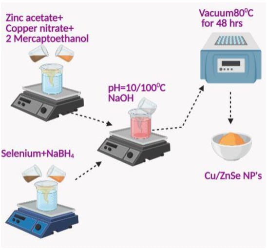 The Cu-doped ZnSe nanoparticles were synthesized by a two-step process. The first step is to dissolve 0.5 M zinc acetate dehydrate solution in 2-mercaptoethanol and 0.01 M copper nitrate solutions by continuously stirring with a magnetic stirrer. Subsequently, selenium powder (0.5 M) was added with sodium hydroxide solution to obtain the sodium hydroxide selenide solution. The zinc and selenium solution was then heated to 100 °C while maintaining the pH at 10 with NaOH. The reaction mixture was then allowed to stir for 24 h at 100 °C. Thereafter, the obtained precipitate was washed with ethanol or distilled water followed by drying in vacuum for 48 h at 80 °C. Finally, the processed powdered sample was kept in an oven for 200 °C. The as prepared powder sample was then used for further measurements. The same method was used for synthesizing 0.05 M, 0.01, and 0.1 M copper nitrate-doped ZnSe nanoparticles [25]. The synthesis process of Cu-doped ZnSe nanoparticles is depicted in Scheme 1.