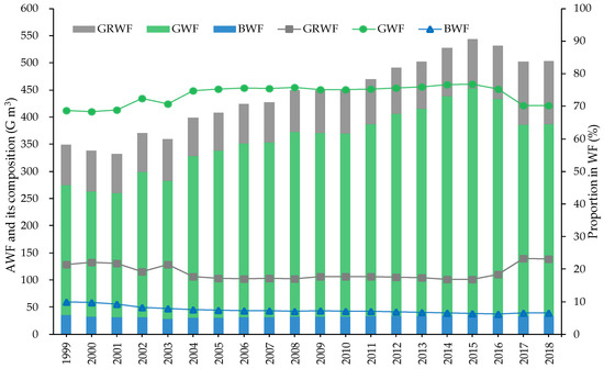 The annual AWF of all the provinces in the YRB during 1999–2018 was 441.6 Gm3, where the blue water footprint (BWF), green water footprint (GWF) and grey water footprint (GRWF) were 32.2, 326.3 and 83.1 Gm3, respectively. The three parts accounted for 7.44%, 73.63%, and 18.93% of the total, respectively. Green water played a dominant role in crop water resource appropriation in the YRB. Figure 2 shows the blue, green, and grey water footprints and their proportions of the AWF in the YRB over the studied period.