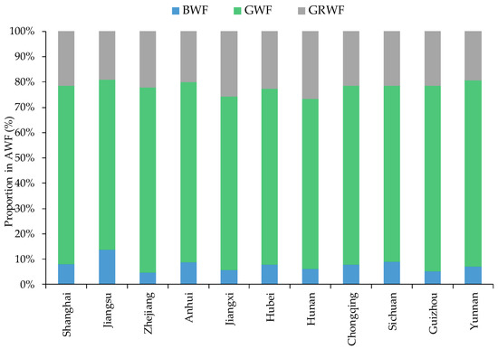 Table 2 reveals that the difference between the minimum value (Shanghai) and the maximum value (Anhui) was 60.46 Gm3. As dominated by the secondary and tertiary industries, Shanghai’s urbanization rate was more than 88%. The effective irrigation area of crops was relatively small, which resulted in the smallest AWF in Shanghai in the whole watershed. The AWF of Anhui and Jiangsu were both above 60 Gm3. As China’s main grain production base, they had a large crop planting area and a great demand for water. In addition, the coefficients of variation in all of the provinces were less than 0.30, with the maximum value of 0.29 in Zhejiang and the minimum of 0.08 in Jiangsu. It was not difficult to find that the provinces with the greatest AWF had a smaller coefficient of variation, which conformed to the law that the coefficient of variation was basically opposite to the spatial distribution pattern of the AWF. The average growth rate of each province was consistent with the variation coefficient. In other words, the annual growth rate of provinces with low coefficients of variation were low. In Shanghai, Jiangsu, Anhui and Sichuan the growth rate was less than 2 percent per year. Among the remaining seven provinces, Zhejiang had the highest annual growth rate, at 3.54%. In order to further understand the consumption of different types of water resources, Figure 3 provides the annual proportion of blue, green and grey water footprints in the AWF for each province.