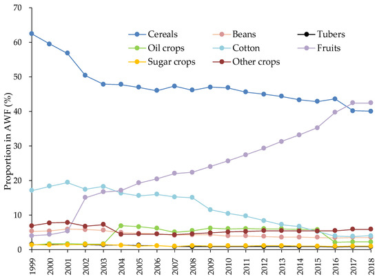 According to Figure 4, the proportion of AWF in the research period could be divided into three stages. Phase I (1999–2001): during which the combined water footprint of grain and cotton accounted for more than 76% of the total AWF, reaching 79.5% in 1999. The water requirement per unit area of cereals and cotton was 600–700 mm, and around 400 mm for other crops. The proportion of cereals decreased rapidly, while that of cotton increased slightly, both of which dominated the trend of the AWF in the YRB. Phase II (2002–2016): during which cereals were still the crop with the largest proportion in AWF, which was always stable at more than 42%. Fruit had overtaken cotton as the crop contributing the second largest amount to the AWF. The proportion of fruit in the AWF was growing rapidly in this sub-period, increasing by nearly 25% in 2016 compared to 2004. In contrast, low productivity and rising labor costs reduced the cotton share by 13.5 percent. Phase III (2017–2018): during which the water footprint of cereals decreased with time and the water footprint of fruits increases rapidly. Fruits became the crop with greatest water footprint in 2017. At this time, cereals and fruits jointly accounted for about 45% of the AWF. According to the above analysis, the changing trend of the AWF was mainly affected by cereals, cotton and fruits. None of the proportions of beans, tubers, oil crops, sugar crops and other crops in the studied period exceeded 10%. The proportion of these crops varied slightly and had little impact on the temporal and spatial distribution of the AWF. The crops that changed significantly during the research were cotton, fruits and grains. At the beginning of the 20th century, the YRB was economically backward, and food and clothing became a national necessity. Cereals and cotton were planted with a large area and high yield, and the AWF was correspondingly large, which was in line with the national conditions at that time. With development of the economy, changes in market demand prompted farmers to keenly produce fruits with higher economic value. Optimizing the planting structure and planting cash crops on a large scale were of great significance to the development of modern agriculture. Figure 5 shows the annual AWF composition structure of eight crops in each province over the period of 1999–2018.