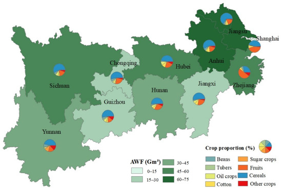 Figure 5 shows the annual AWF and crop composition in each province in order to observe the spatial distribution of water use. It can be seen from the figure that Jiangsu and Anhui had the greatest water footprint, while Shanghai had the smallest. The water footprint of most provinces was still dominated by grain crops. In Jiangsu, Anhui and Sichuan, grain crops accounted for more than 65% of the AWF, of which cereals accounted for about 58%. Cereals per unit area required a large amount of water. The sowing area of cereals in Chongqing and Guizhou was small, which directly led to their small AWF. On the other hand, only Shanghai and Zhejiang were dominated by cash crops, accounting for 53% and 66%, respectively. The per capita arable land resources in Shanghai and Zhejiang were lower than the national level. The acceleration of industrialization and urbanization had intensified tensions around land resources. The increasingly acute contradiction between people and land forced the transformation of cultivated land use types and crop planting patterns. More and more farmers favored high-yield cash crops. In addition, large amounts of chemical fertilizer application and serious non-point source pollution in Zhejiang resulted in a high grey water footprint, which increased the AWF in Zhejiang. It is worth noting that the grain output of Jiangxi and Yunnan was similar, but Yunnan’s AWF was higher than that of Jiangxi. Because other crops accounted for a relatively large proportion in Yunnan, especially the tobacco industry and tea industry which were key pillar industries, and these cash crops contributed a large water footprint.