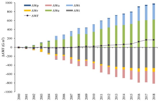 The annual value of the ΔWF in the YRB was 36.52 Gm3, indicating that the agricultural water consumption increased over the past 20 years. The annual values of the selected six factors (ΔWi, ΔWe, ΔWr, ΔWt, ΔWu, and ΔWp) were calculated to be −274.25, 317.53, −39.19, 148.02, −123.39 and 8.59 Gm3, respectively. Figure 6 shows the analysis results of factors affecting AWF changes over time.